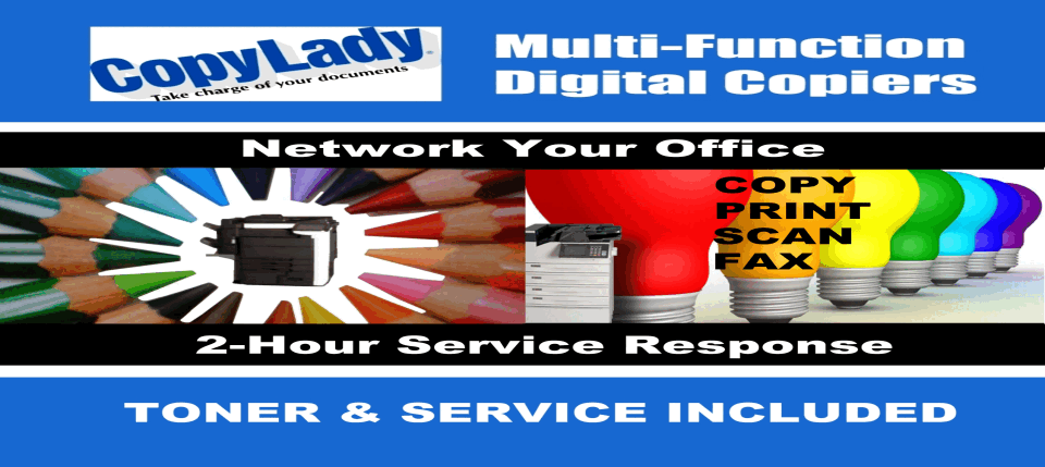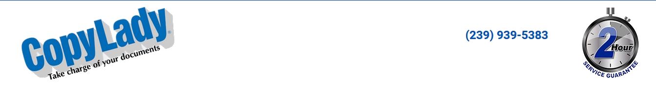 CopyLady: Proudly serving Fort Myers, Cape Coral, Fort Myers Beach, North Fort Myers,Lehigh Acres and SouthWest Florida since 2002!Get your KYOCERA Printer or Copier from CopyLady today, and experience the CopyLady difference!Big or small, at CopyLady, we got them all! Desktop printers and copiers, Console printers and copiers, and even plotters!We carry Multiple models of Kyocera machines, from the ECOsys Desktop models, to the workhorse TASKalfa consoles! We even have Kyocera's plotter brand, KIP!Already got a KYOCERA machine? Does it need a little help to be great again? We can fix it up for you! We offer the lowest hourly service rates in the state! We also carry all the parts and supplies your KYOCERA will ever need to stay running in tip top shape! With our 2-HOUR RESPONSE GUARANTEE, Your operations will never stop for machine issues!Get back in the game FAST with CopyLady's 2-Hour response guarantee! Gone are the days of waiting forever to get a copier problem solved!We are the ONLY dealer in the WORLD to offer service this fast! No matter what help you need, or what ails your machine,we will be there within 2 hours of you calling us! Our highly trained technicians are fully certified, and ready to help get your machine up andrunning again! In many cases, we can help you solve your issues over the phone without a technician coming to visit! Our highly skilled help desktechnicians can solve just about any issue, big or small, during your phone call to us. If we can't fix it here, we'll fix it there within TWO HOURS!Get rid of that massive toner stockpile! We got you covered!Your CopyLady service agreement comes with the toners you need to keep your machine cranking out good things!What's better, is thanks to our revolutionary Toner Replenishment System (TRS), You'll NEVER have to call and order toners! We got you covered!Once we see you are low on a toner, One of our technicians will bring a fresh one out to you! We carry a full selection of toners in our Fort Myerswarehouse, No need to wait for it to come from some other state! And yes, It's FREE!!!Put something cool in that space where you were stockpiling toners!Got BIG plans? Well you'll need a BIG printer!Whether it's blueprints, an area map, or the schematics to the international space station, We got you covered with our high quality plotters!With sizes up to 44 inches, Let your creativity soar! Razor sharp Black & White, and Colors so vibrant that they pop right out of the page!It's time for you to pick up that phone, Call us at 239-939-5383, and let us put a CopyLady Kyocera in YOUR office!High quality equipment, Fastest response times in the industry, and free supplies! Can't beat that! Call now or check out our specials!Call CopyLady Today at 239-939-5383Serving Fort Myers, Cape Coral, Naples, Bonita Springs, Lehigh Acres, Sanibel, and Southwest Florida since 2002.
